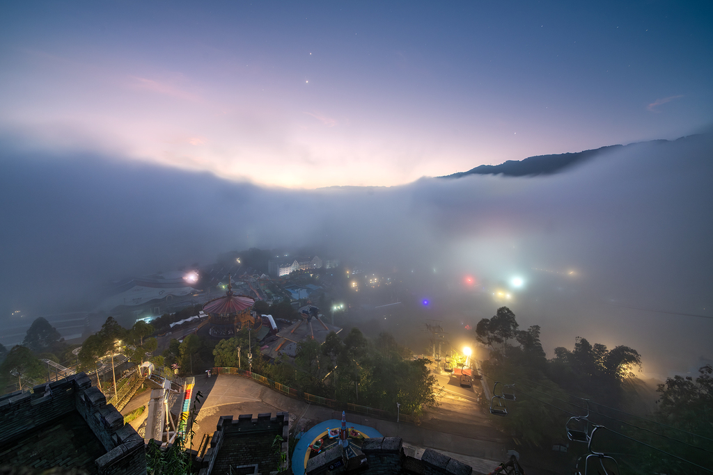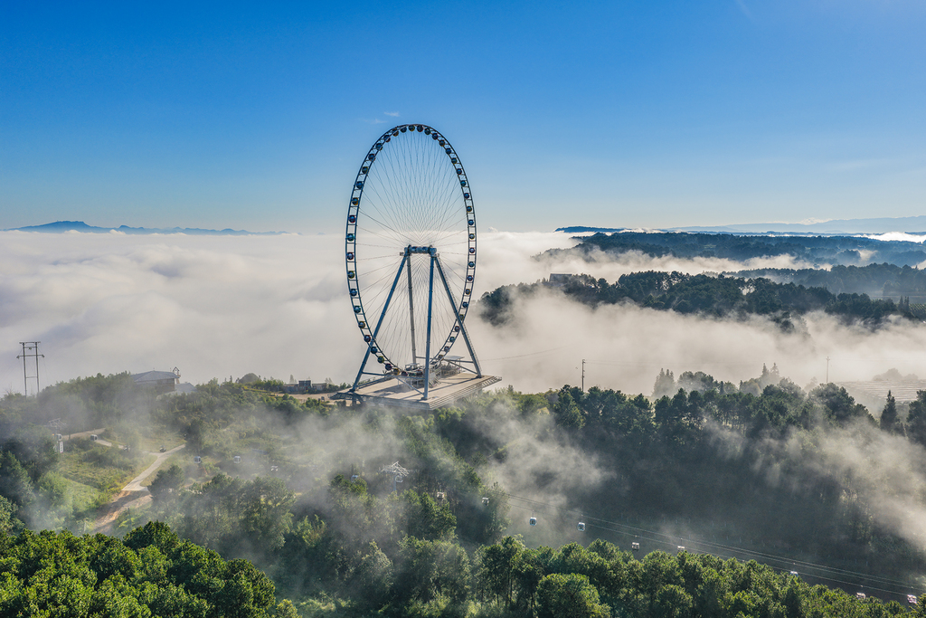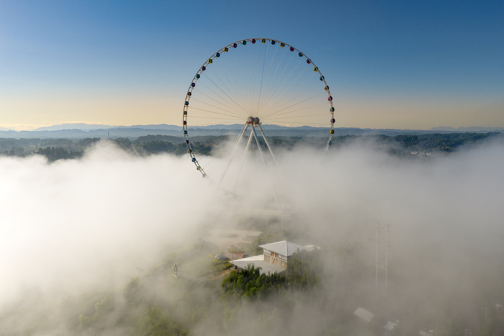 清晨时分,平流雾如轻纱般弥漫在山间,“乡村振兴之眼”摩天轮在雾气中时隐时现,仿佛漂浮在空中的梦幻城堡。轿厢在缓缓转动中,将周边被雾笼罩的绿水青山、田园村落等美景尽收眼底,给人一种置身仙境的奇妙感觉。