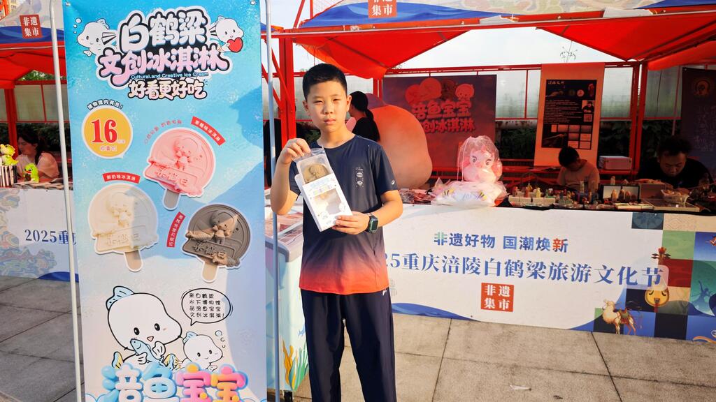 从重庆江北区赶来的小朋友何俊彦,小手紧紧攥着一支白鹤梁文创冰淇淋,嘴角还沾着一点奶油,脸上满是满足的笑容:“之前,我跟爸爸妈妈去看过白鹤梁,印象很美好。这个文创雪糕既好看又好吃,我太喜欢啦!”